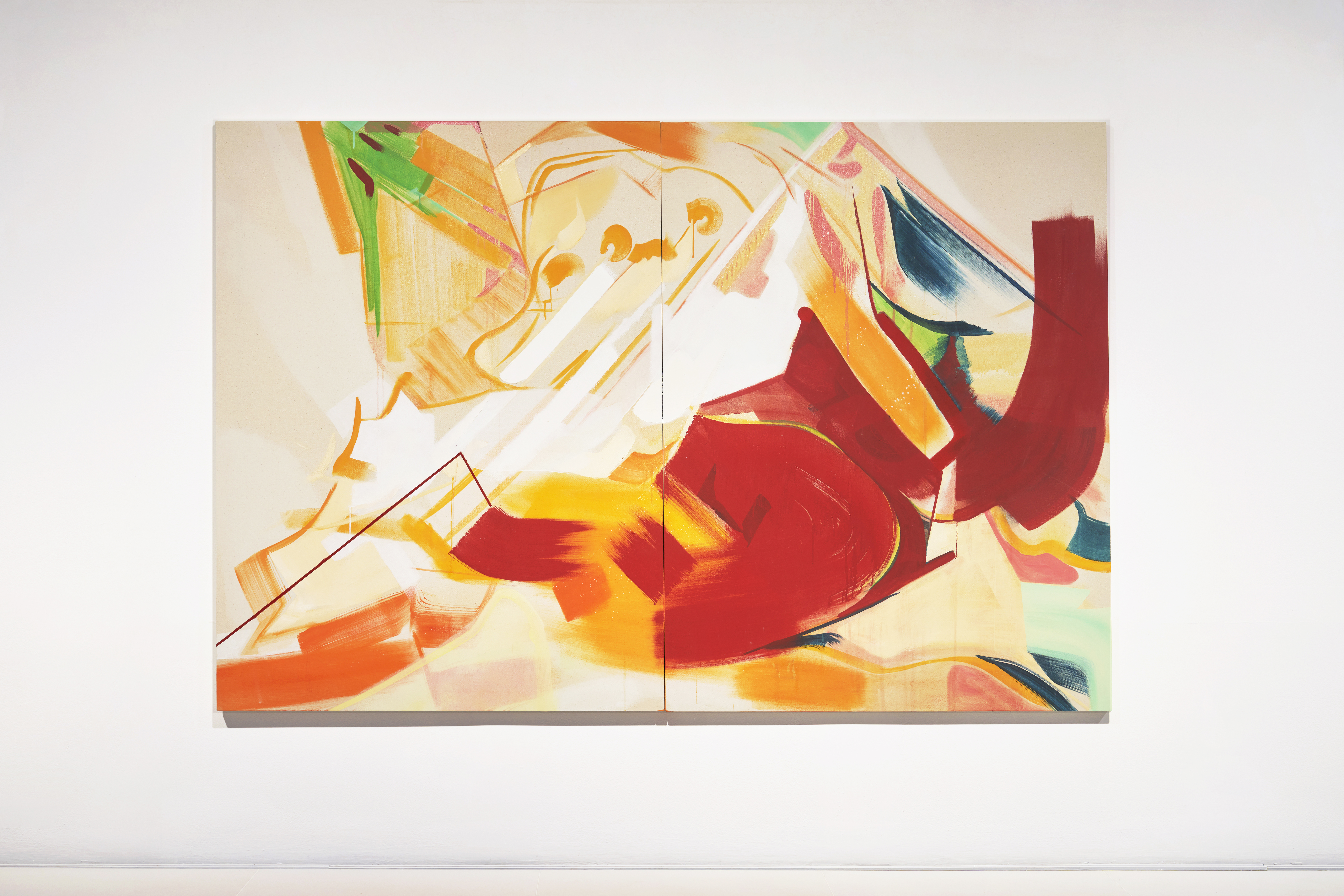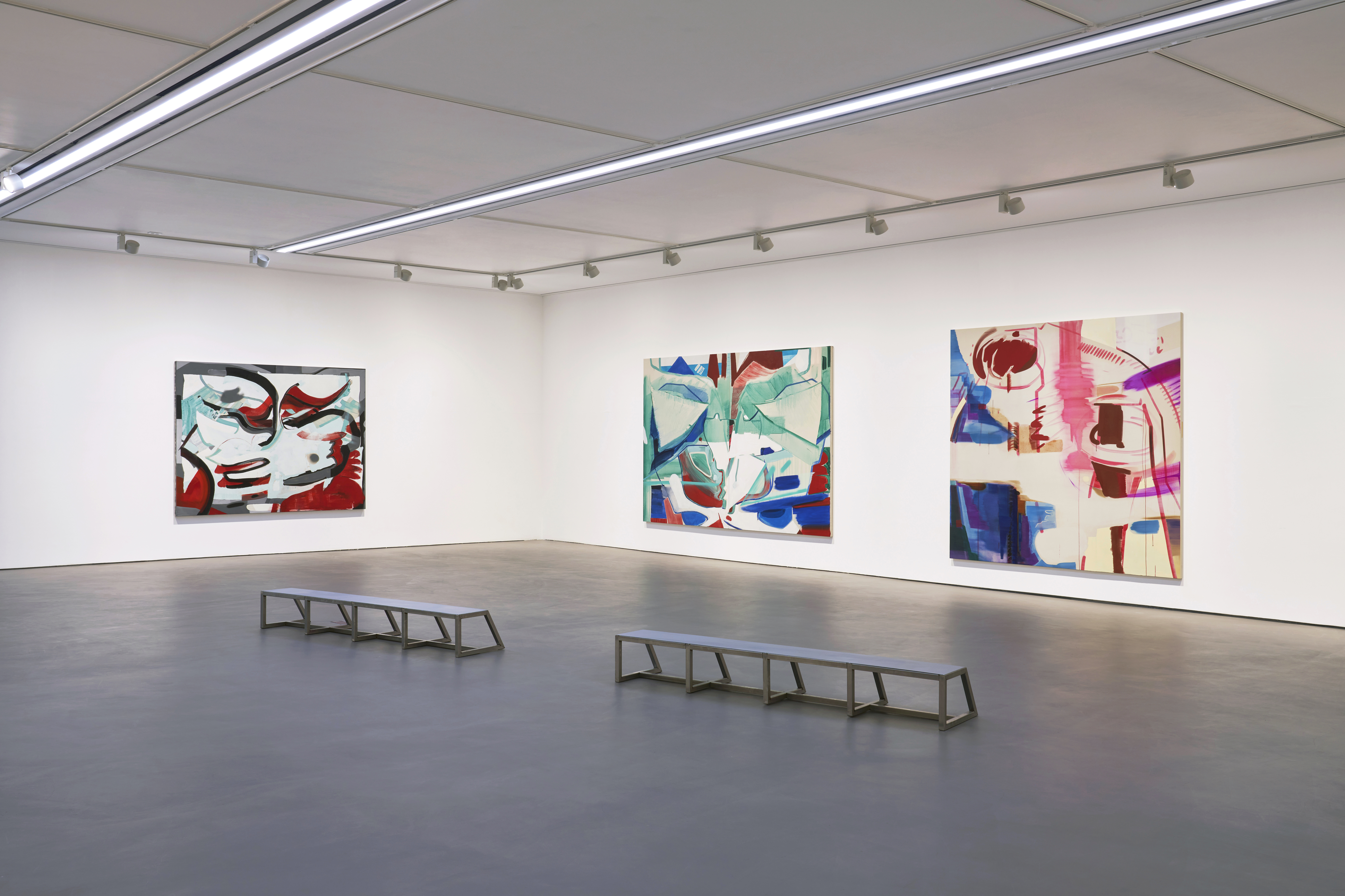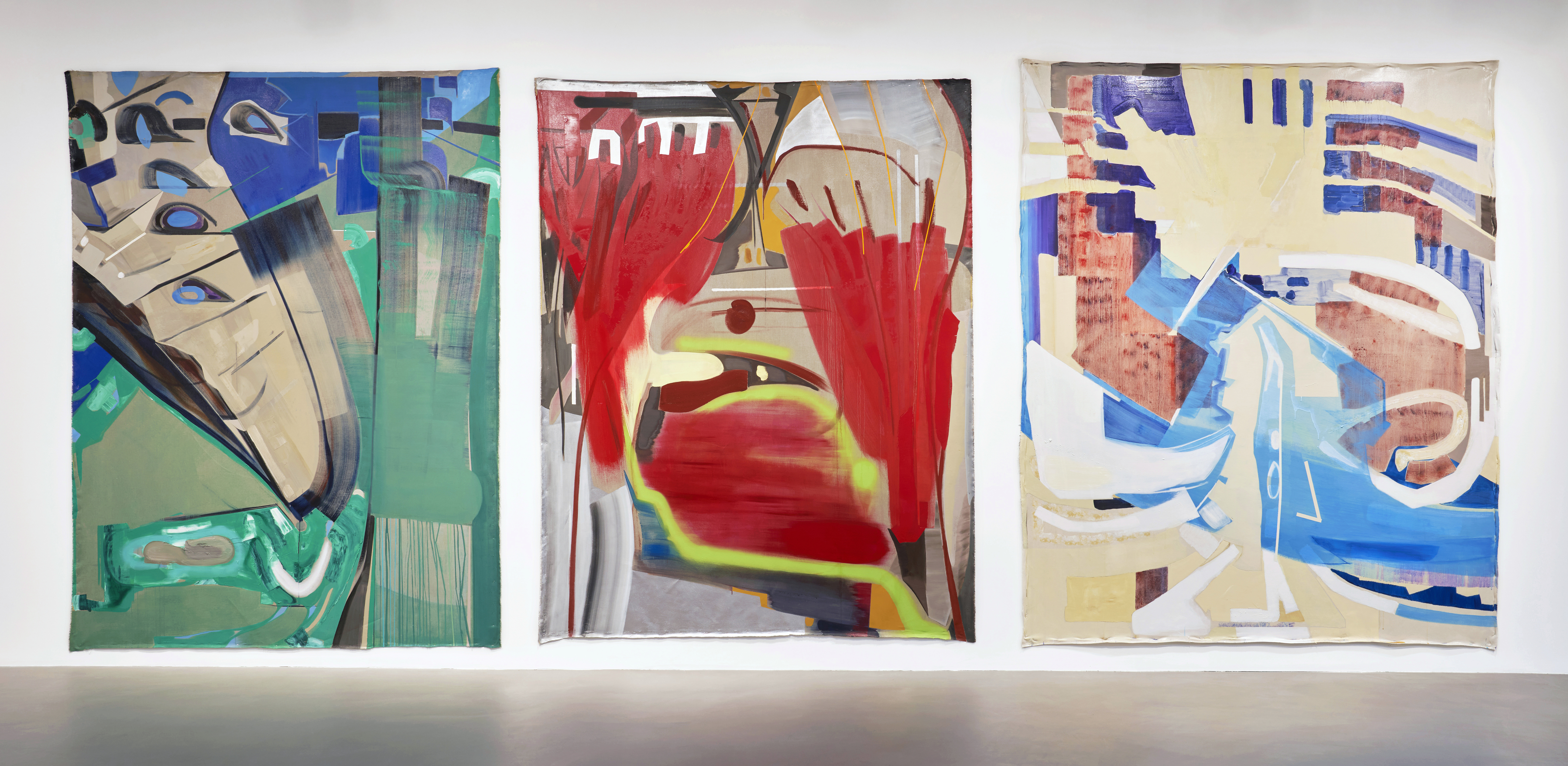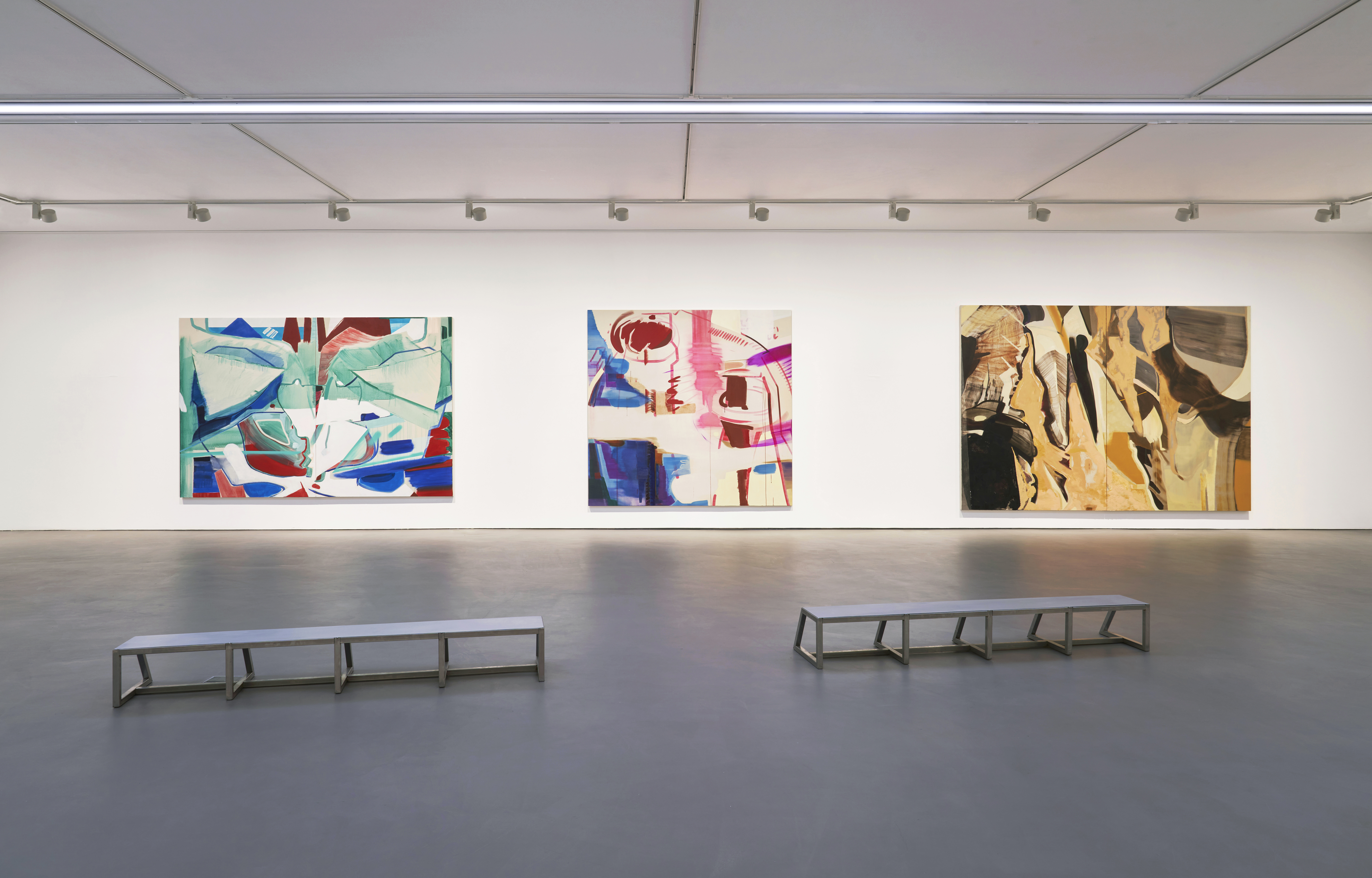 (Left) 터널 / Sinus, 296×226.5cm, water mixable oil and acrylic spray paint on canvas, 2022 (Middle) 힘의 줄 / Collected sinew, 284 x 226cm, water mixable oil and acrylic spray paint on canvas, 2022 (Right) 토르소의 안쪽 얼굴 / The face of flipping torso, 298 x 245cm, water mixable oil on canvas, 2022 Installation view of PIT STOP, Doosan Gallery, 2022, Seoul Installation view of PIT STOP, Doosan Gallery, 2022, Seoul
