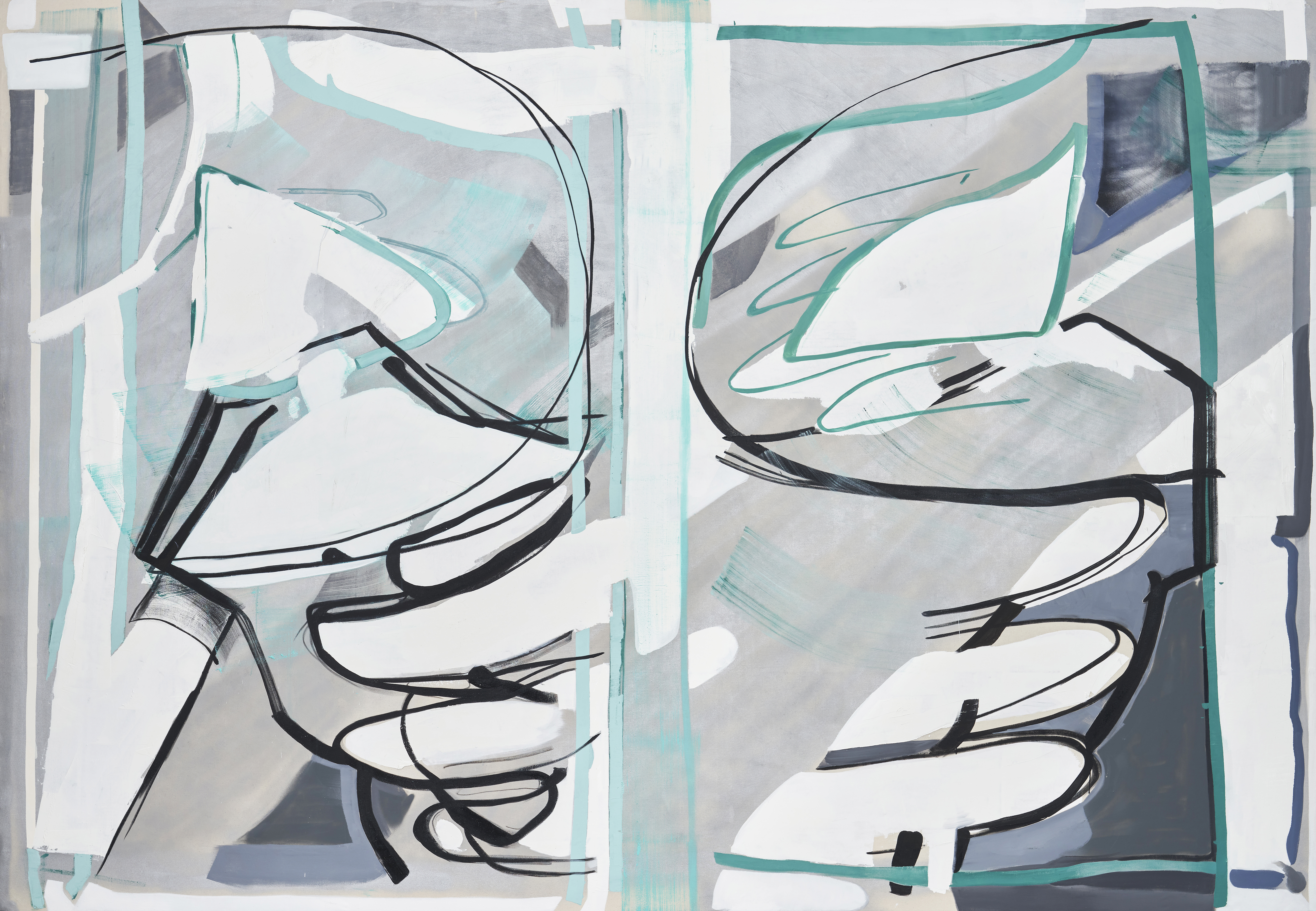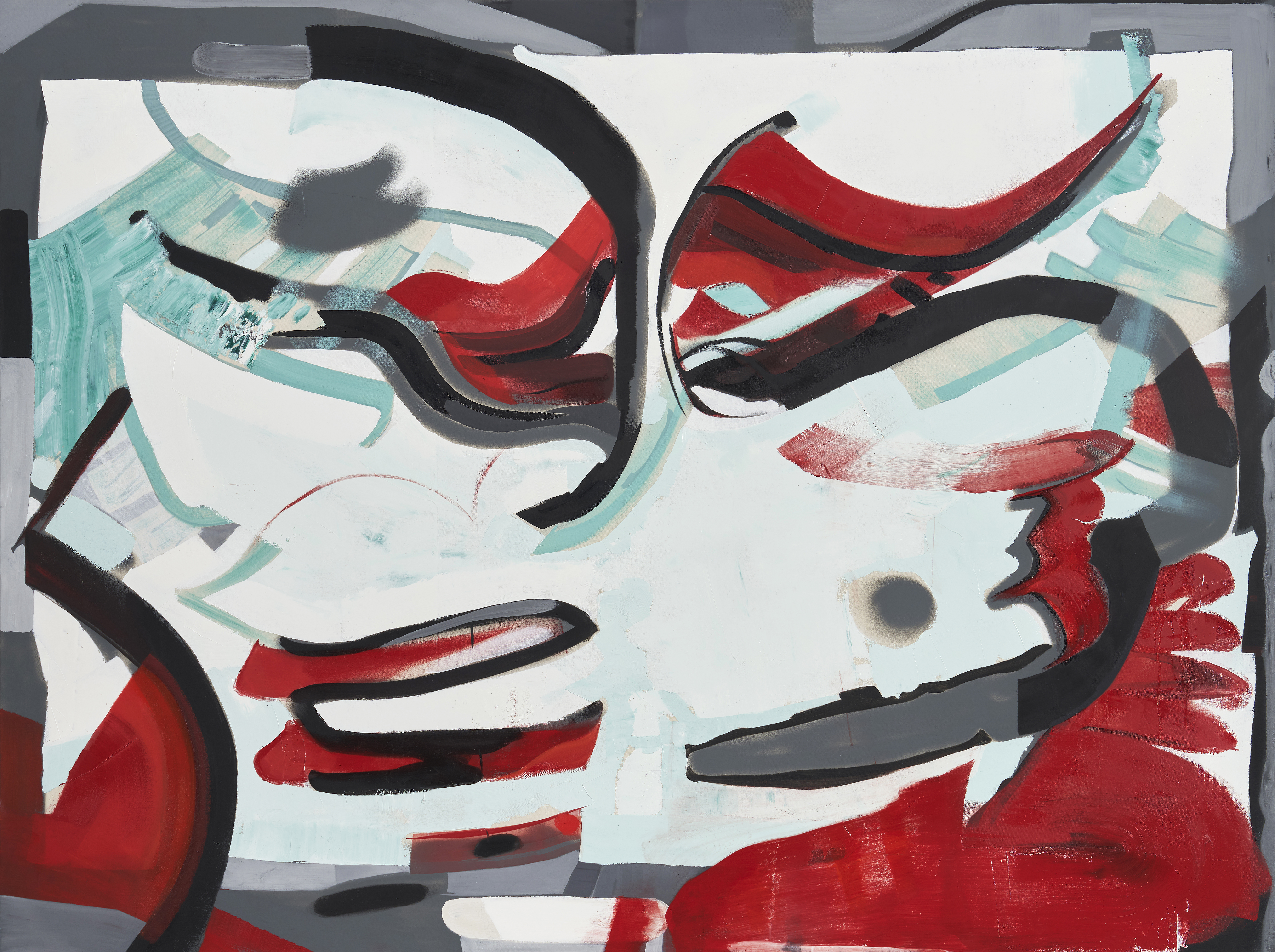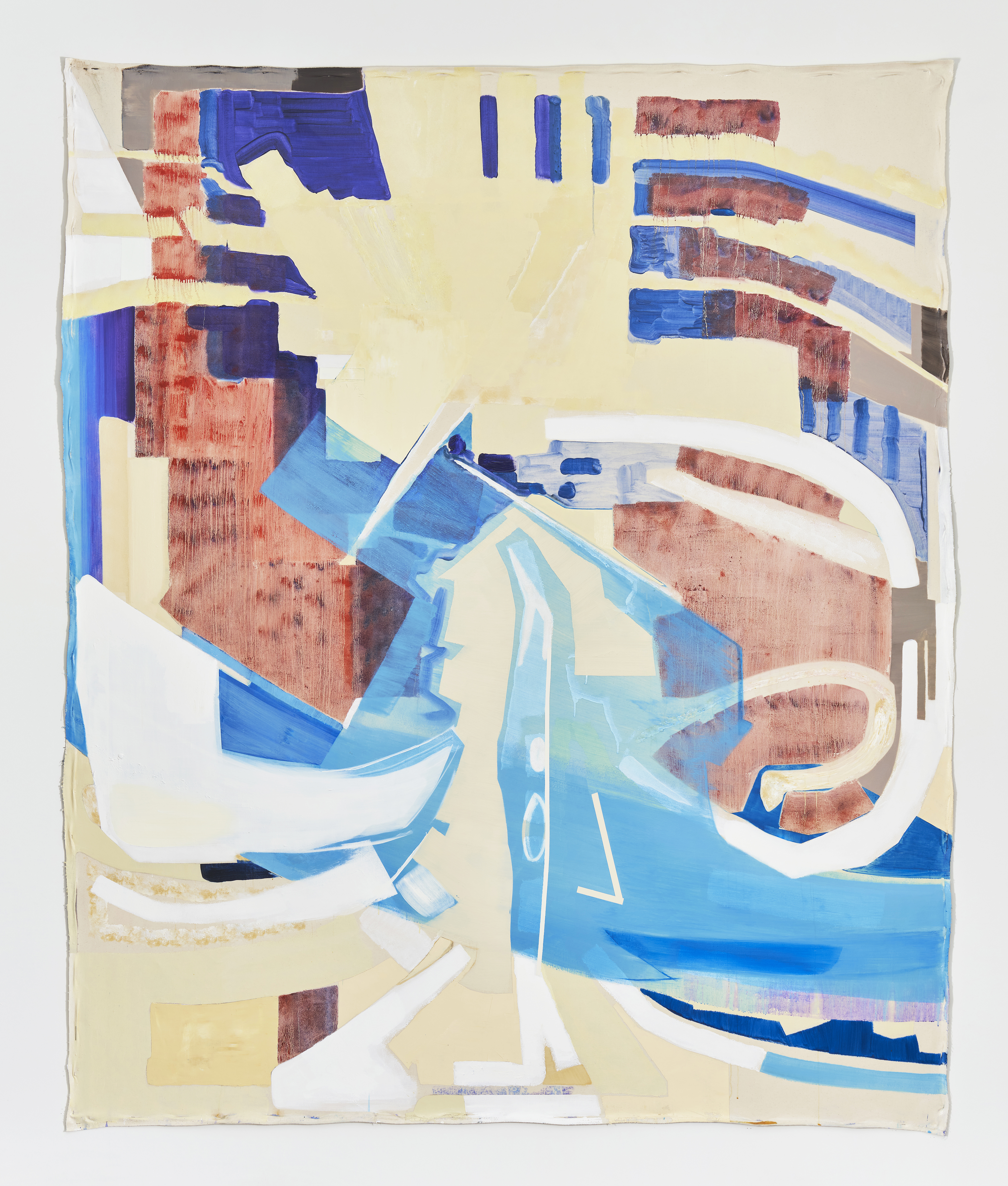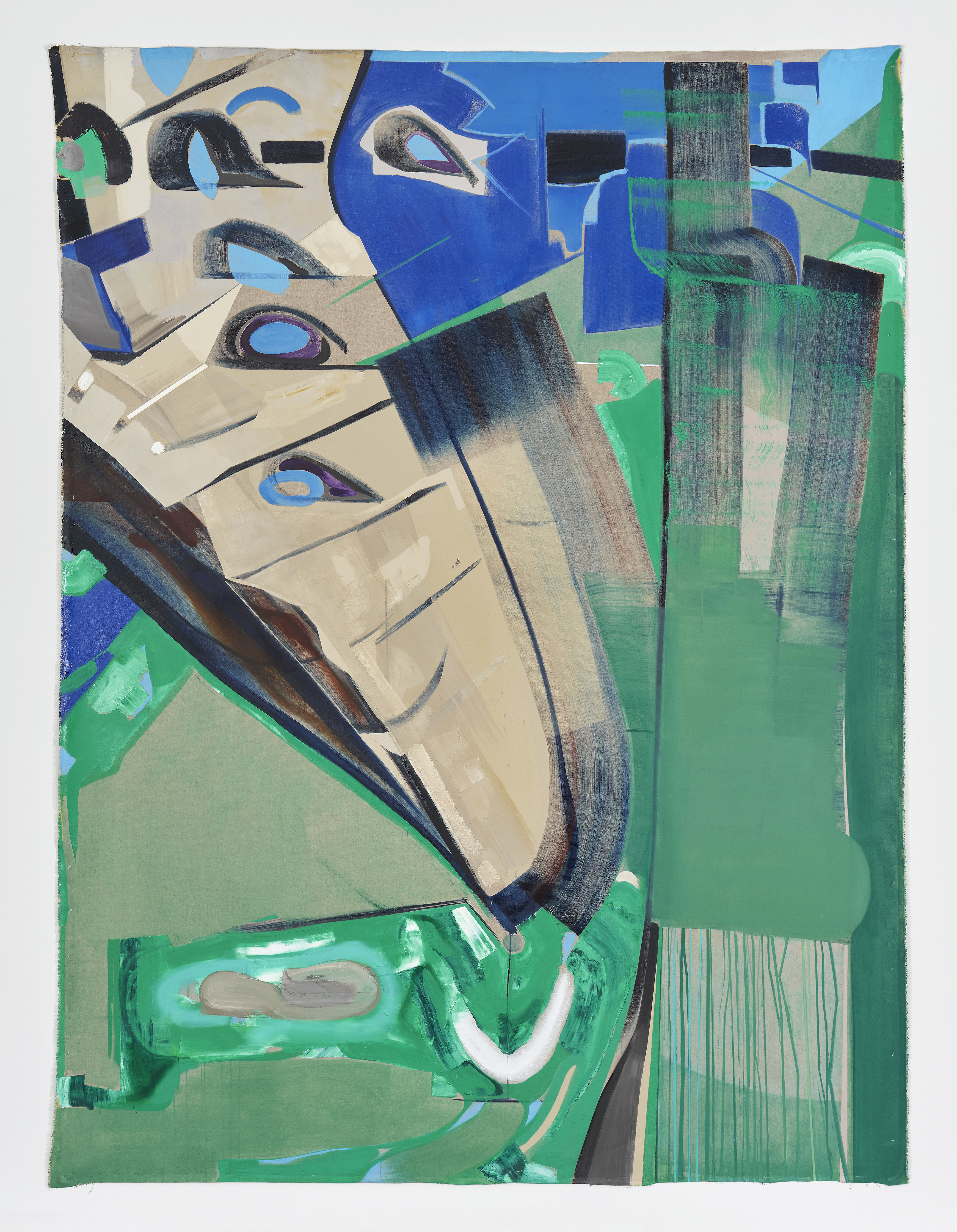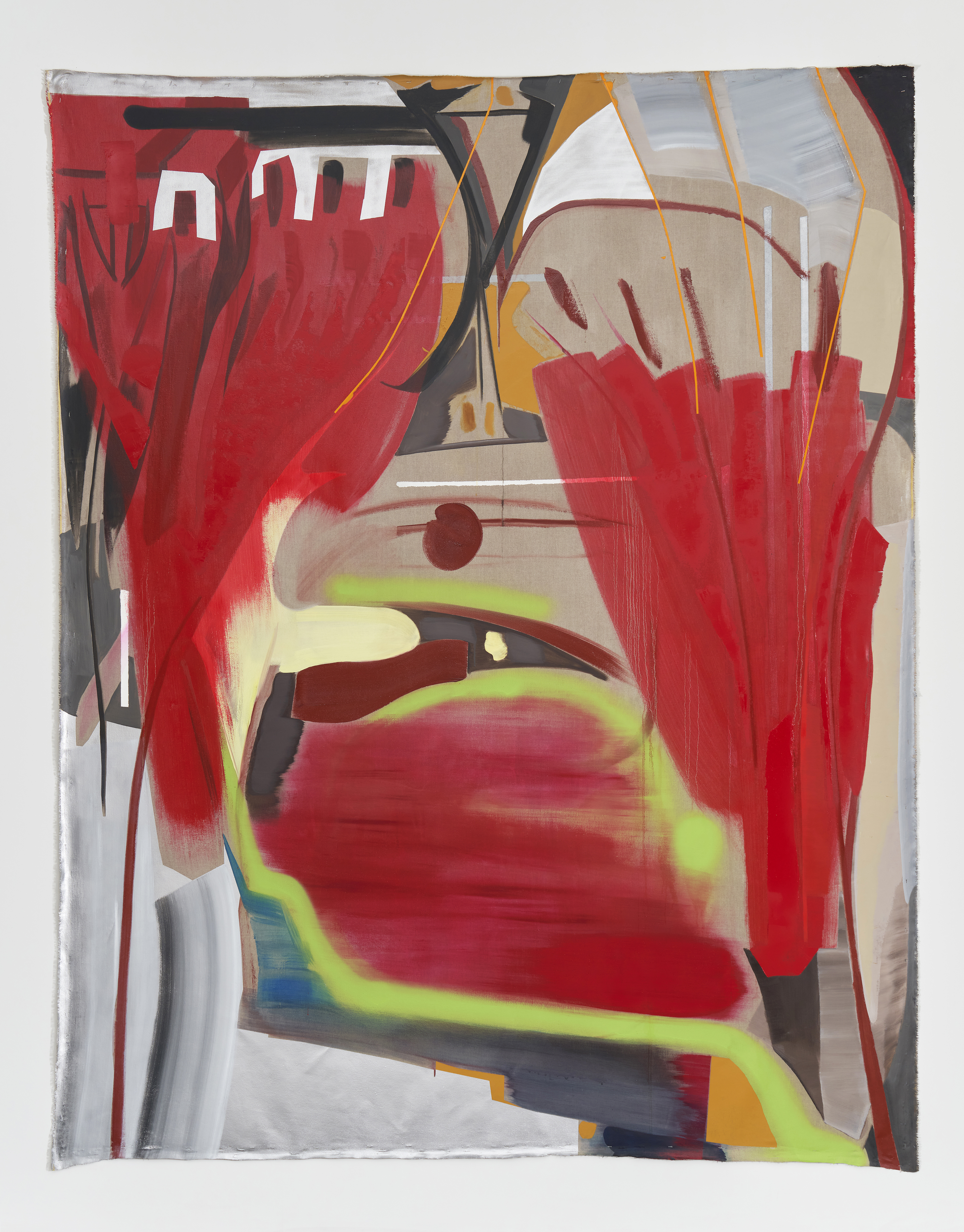 (Left) 터널 / Sinus, 296×226.5cm, water mixable oil and acrylic spray paint on canvas, 2022 (Middle) 힘의 줄 / Collected sinew, 284 x 226cm, water mixable oil and acrylic spray paint on canvas, 2022 (Right) 토르소의 안쪽 얼굴 / The face of flipping torso, 298 x 245cm, water mixable oil on canvas, 2022 Installation view of PIT STOP, Doosan Gallery, 2022, Seoul Installation view of PIT STOP, Doosan Gallery, 2022, Seoul